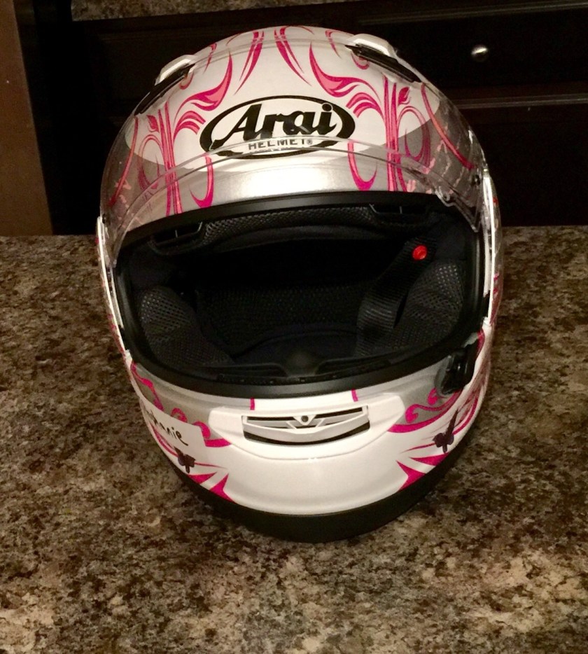 I chose a white helmet with pink piping and butterflies. It’s very feminine and it makes me smile since it’s very tongue-in-cheek. I’m not really that feminine in general.
