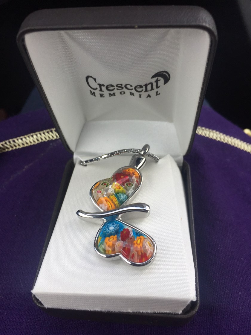 I also received the glass art spheres that Crescent Memorial Art Glass created for me and I also bought a butterfly pendent for his mom since she was missing one. I plan on only taking one sphere with me, just in case. The other sits on top of his ashes and the colors are striking with the sunlight from the windows.