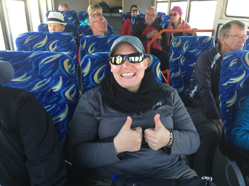 We managed to flag down a big tour bus. He driver cab was separate from the cab with the tourists but he waved us on. The tour guide was not happy about it, claiming it was against company policy in case of accidents but she couldn’t kick us off without looking like an asshole.