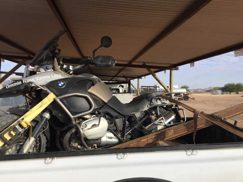 Andrew came back and we got the boxes off with my stuff and had a guy named Gunther Heimstadt with Bateleur Helicopters stopped and gave me a ride into town while Andrew stayed with the bike.